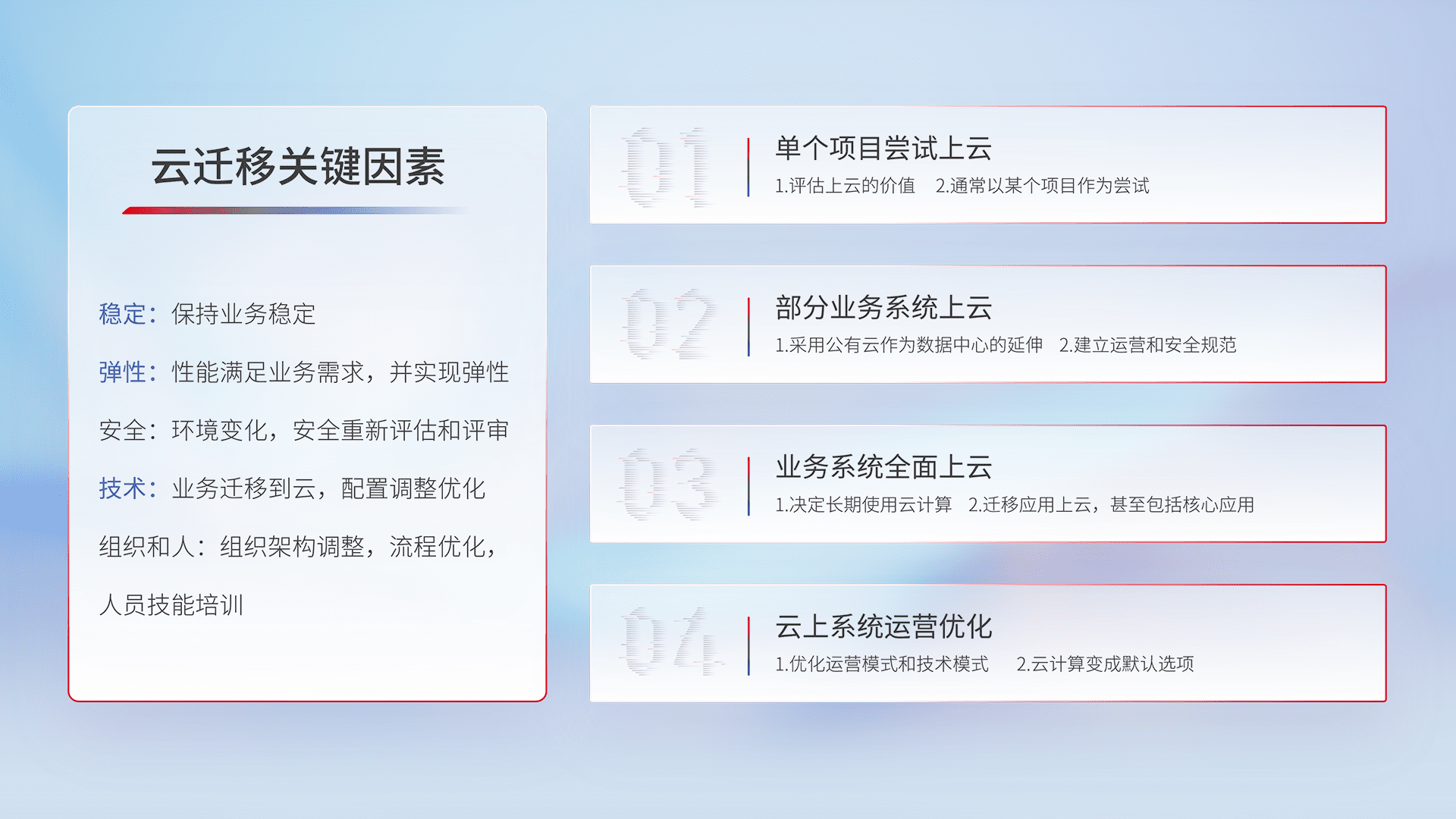 结合实际业务,,从规划设计、、、、云平台选型、、、、云原生改造、、、数据迁移、、、集成交付,,迁移全过程为客户识别最佳上云路径,,,,做好风险识别管理,,,,设计网络架构、、身份权限、、、、安全审计合规、、、操作审计、、、日志审计、、、监控告警策略、、、、多站点容灾设计等,,对云上基础设施进行整体规划,,提升IT治理水平,,以满足弹性、、、、高可用、、、高性能的需求。。。