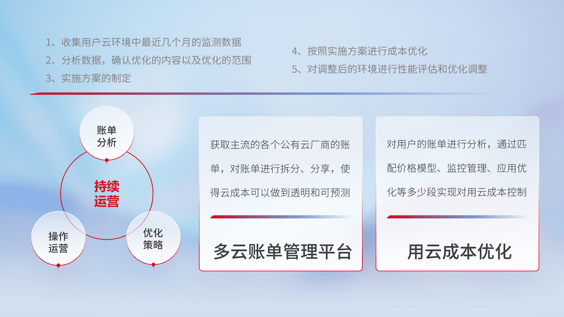 通过灵活运用多种自动化迁移工具,,,,帮助企业用户实现业务和数据高效 、、、、稳定的上云迁移和云上迁移,,,,采用自研多云纳管平台,,,以中立管理模式,,,解决多组织、、多云、、、多运维厂商的复杂关系的管理,,,,保证多云平台资源配置的一致性,,实时掌控云资源运行数据,,,,运用智能化工具分析云资源多云平台的管理服务,,透明化管理成本支出,,用云成本可预测、、、用云费用可优化、、、、云资源配额有据可依。。