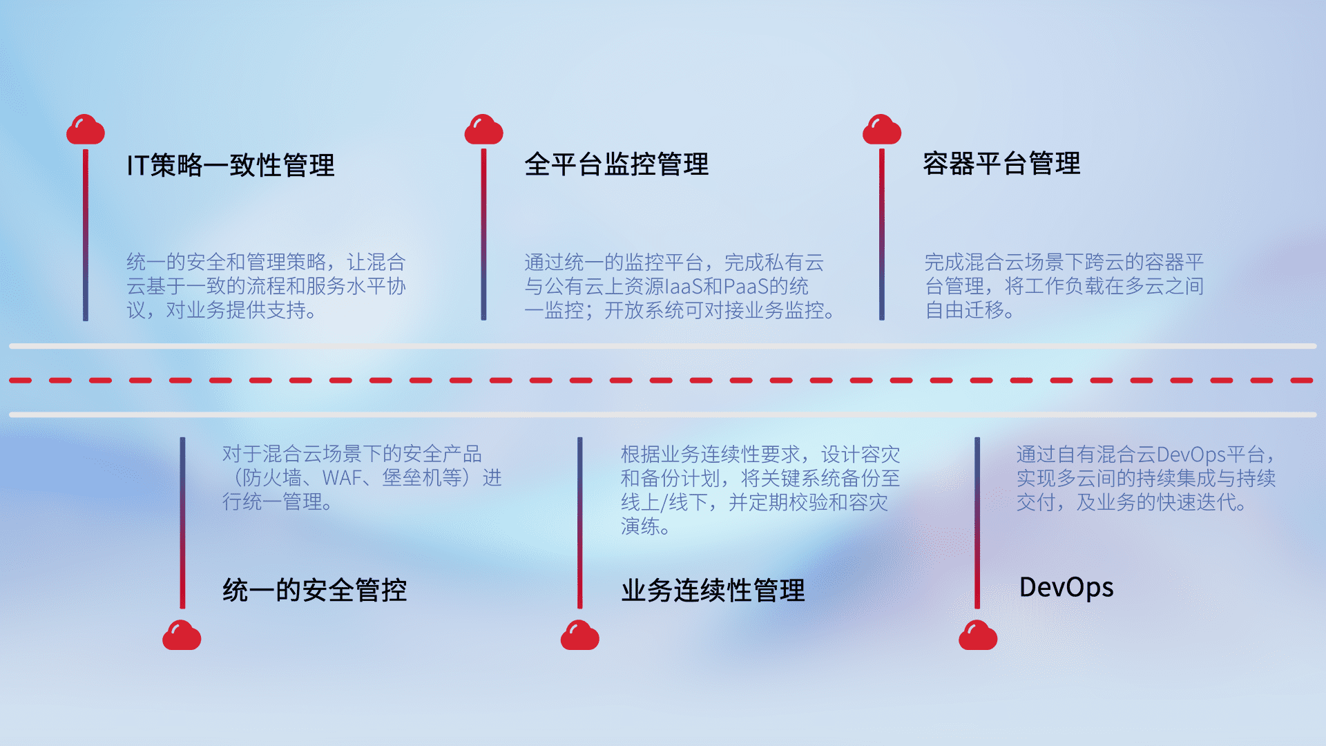 通过多云纳管,,,以统一的资源数据模型把客户的云资源进行抽象和封装,,,进而实现对多云资源的统一操作,,,保障云资源管理的可靠性、、稳定性与可用性。。量身定制化运维内容,,配置、、、、开发运维、、、补丁管理、、、备份、、、、监控、、、、认证和访问管理、、审计和日常巡检等,,保障在用云过程中的可靠度,,稳定度以及高可用率。。