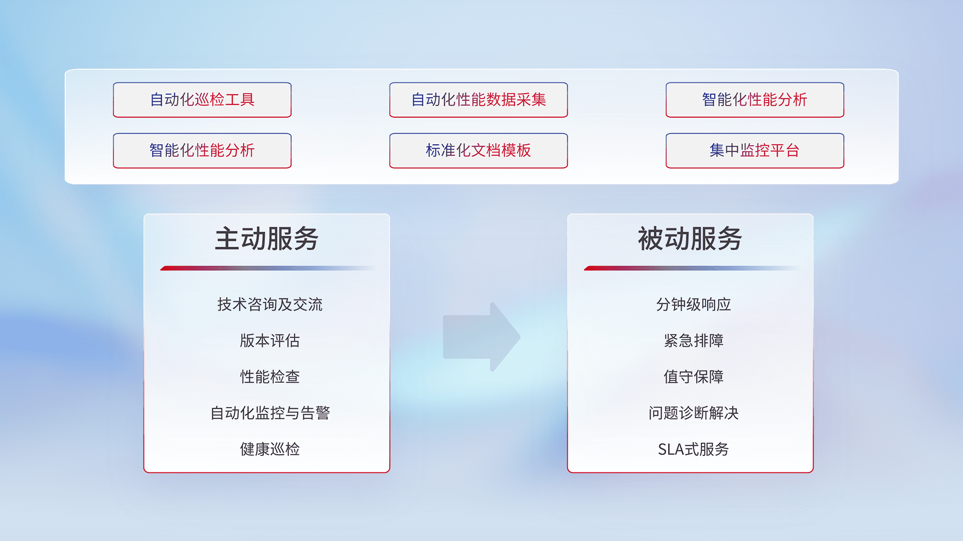 智能化工具和标准化文档,,,保障服务质量,,,,提供主动服务(包含技术咨询、、、版本评估、、、性能检查、、、、自动化监控与告警、、健康巡检)和被动服务包含(分钟级响应、、、紧急排障、、、、值守保障、、问题诊断解决、、、、SLA服务)。。